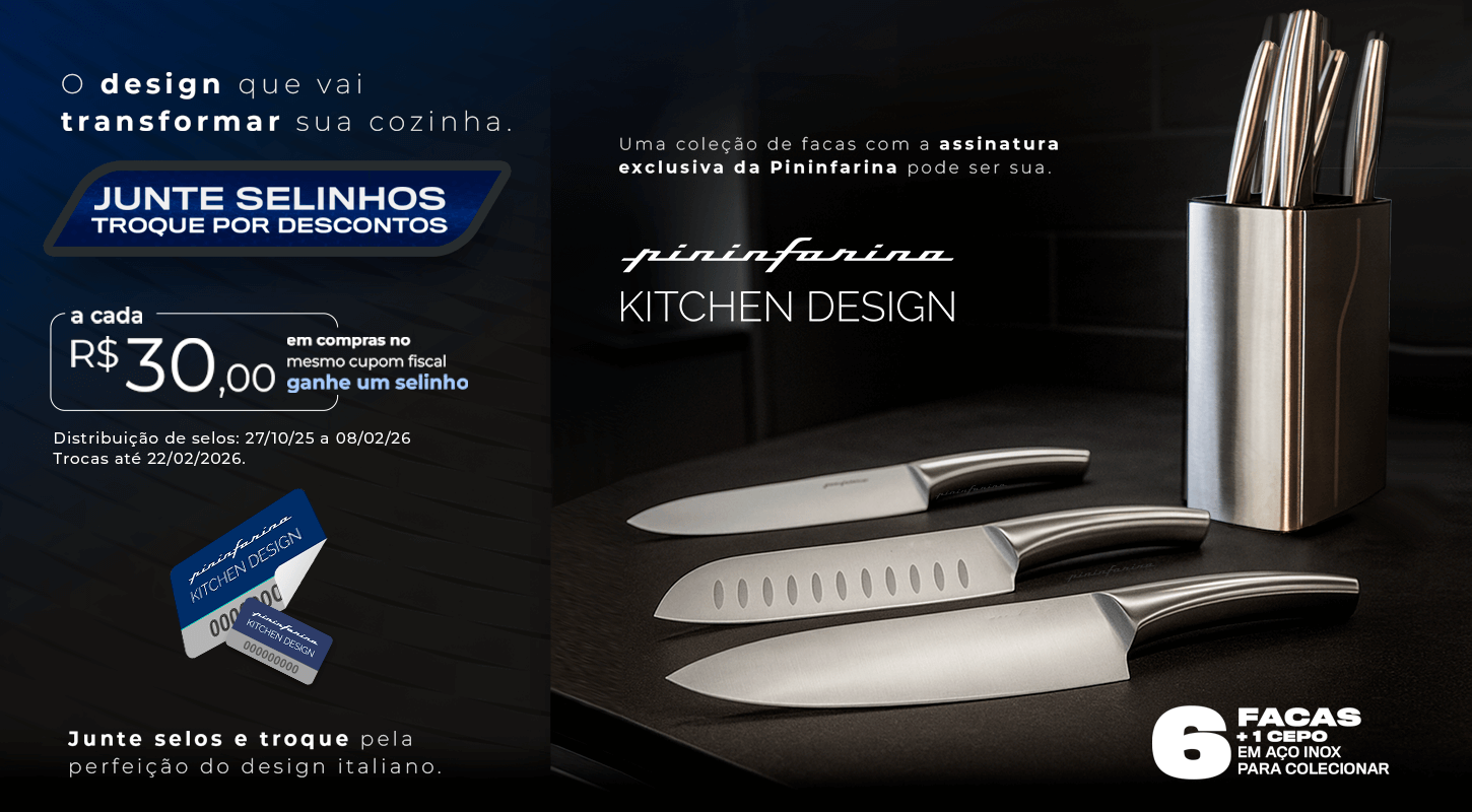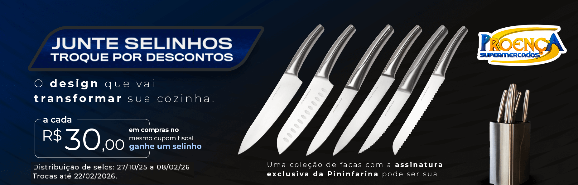 É uma ação do Proença Supermercados em que você junta selinhos a cada R$30 em compras e troca por facas e cepos da linha italiana PININFARINA com até 90% de desconto.