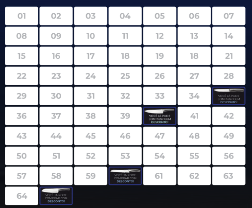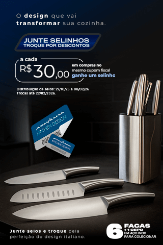 Cole os selos na cartela disponível nas lojas e, quando atingir a quantidade necessária, troque por sua faca ou cepo com desconto no caixa.